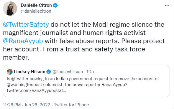 Danielle Citron, a professor at UVA Law, said, “Twitter Safety do not let the Modi regime silence the magnificent journalist and human rights activist Rana Ayyub with false abuse reports. Please protect her account. From a trust and safety task force member.” Citron might be unaware that Ayyub has been accused of misappropriation of funds she had collected during the Covid period to help people.