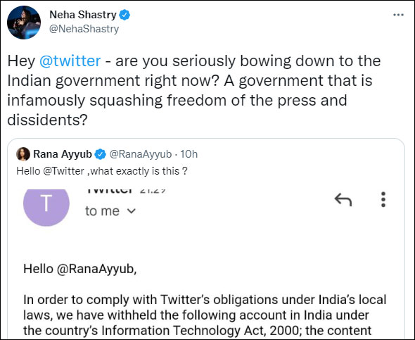 One Neha Shastry who identifies herself as ‘Director’ said, “Hey @twitter – are you seriously bowing down to the Indian government right now? A government that is infamously squashing freedom of the press and dissidents?”