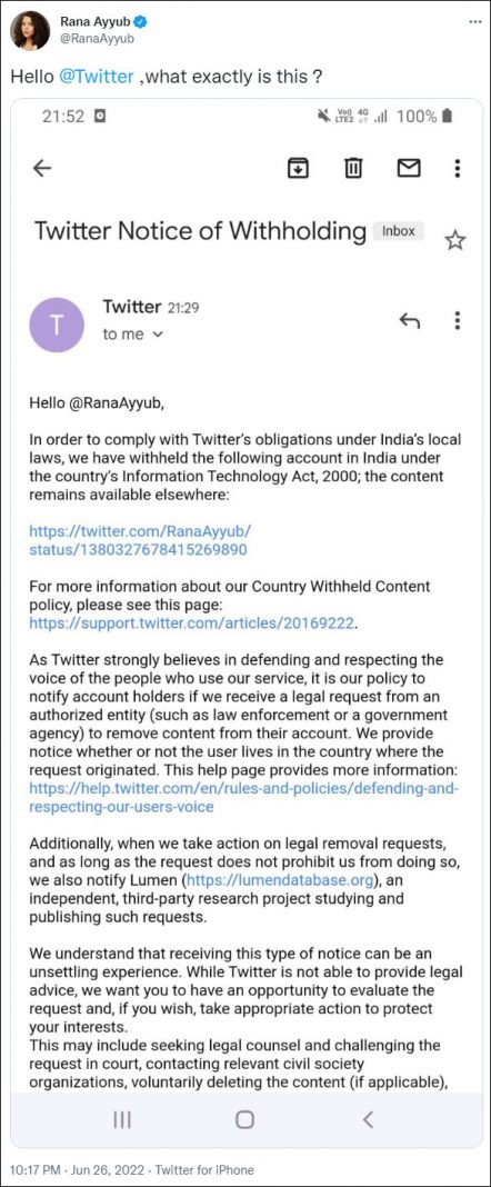 Ayyub added a screenshot of the email she received from Twitter and wrote, “Hello Twitter, what exactly is this?” In the email received at 9:29 PM, it was mentioned that a particular tweet was withheld in India under the Information Technology Act, 2000. The content of the Tweet was blocked only for the Indian audience, and Twitter users from other countries could access it.