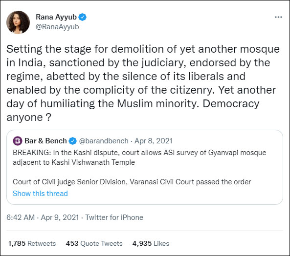 In the tweet that has not been withheld by Twitter, Ayyub had said, “Setting the stage for demolition of yet another mosque in India, sanctioned by the judiciary, endorsed by the regime, abetted by the silence of its liberals and enabled by the complicity of the citizenry. Yet another day of humiliating the Muslim minority. Democracy anyone?” The tweet was published on April 9, 2021. Ayyub was quoting a tweet by Bar & Bench where it was reported that the court had allowed an ASI survey of the disputed structure known as Gyanvapi ‘mosque’ adjacent to Kashi Vishwanath Mandir.