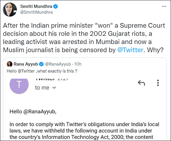 Director Smriti Mundhra said, “After the Indian prime minister “won” a Supreme Court decision about his role in the 2002 Gujarat riots, a leading activist was arrested in Mumbai, and now a Muslim journalist is being censored by @Twitter. Why?” Mundhra must be unaware of the fact that while unholding the SIT report on giving clean chit to Prime Minister Narendra Modi in the 2002 Gujarat Riots, the apex court had clearly pointed out that people with vested interest ran propaganda against the state of Gujarat and PM Modi. The activist she was referring to was Teesta Setalvad, who has been accused of submitting forged documents and statements of the eyewitnesses and tutoring victims to malign the image of PM Modi and the state of Gujarat. She has also been accused of misappropriating funds she collected for 2002 riots victims.