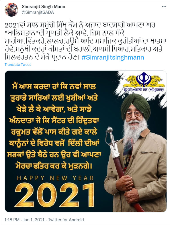 In 2021, while wishing for the new year, he said on Twitter, “May 2021 bring freedom for the Sikh community in form of ‘Khalistan’ that will eradicate social evils such as coercion, discrimination, greed, ego, etc. and restore human values, mutual love, respect, and cooperation.”