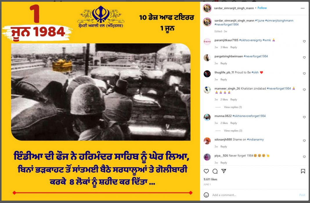 On Operation Blue Star anniversary this year, he published a post in which he said, “The Indian Armed Forces surrounded Golden Temple. Without provocation they opened fire at peaceful devotees and killed eight people.”