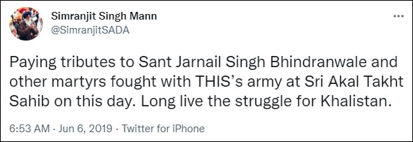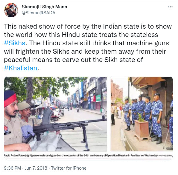 In 2018, while sharing photographs of security forces deployed on the anniversary of Operation Blue Star, he wrote, “This naked show of force by the Indian state is to show the world how this Hindu state treats the stateless Sikhs. The Hindu state still thinks that machine guns will frighten the Sikhs and keep them away from their peaceful means to carve out the Sikh state of Khalistan.”