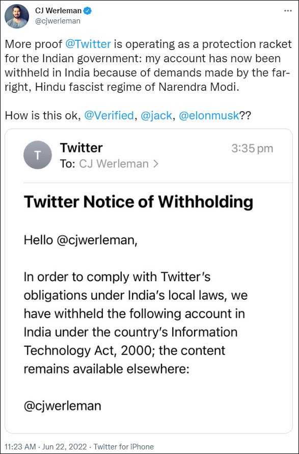 Irked by the decision made by Twitter, Werleman has started ranting on Twitter. In a tweet, he blamed Twitter for operating on the behest of the BJP-led Government of India for his account getting blocked for the Indian audience. He said, “More proof @Twitter is operating as a protection racket for the Indian government: my account has now been withheld in India because of demands made by the far-right, Hindu fascist regime of Narendra Modi. How is this ok, @Verified, @jack, @elonmusk?? in response to a legal demand.”