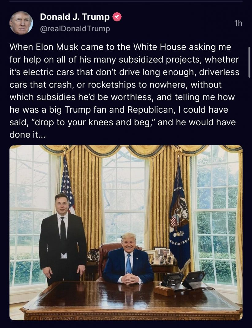 “When Elon Musk came to the White House asking me for help on all of his many subsidized projects, whether it’s electric cars that don’t drive long enough, driverless cars that crash, or rocketships to nowhere, without which subsidies he’d be worthless,” Trump wrote, “and telling me how he was a big Trump fan and Republican, I could have said, ‘drop to your knees and beg,’ and he would have done it,” Trump said in a post on Truth Social.