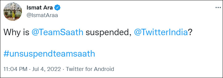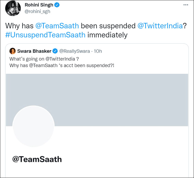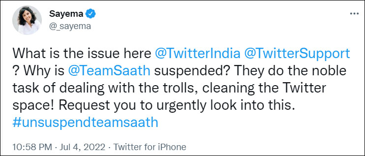 RJ and propagandist Sayema said, “What is the issue here, Twitter India? Why is Team Saath suspended? They do the noble task of dealing with the trolls and cleaning the Twitter space! Request you to urgently look into this.”