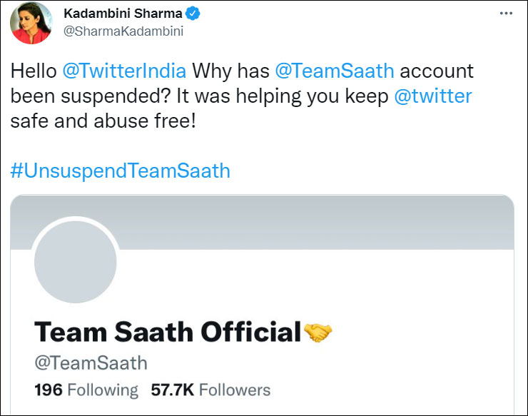 NDTV’s Kadambini Sharma also questioned the suspension and claimed Team Saath was helping Twitter to keep the platform safe and abuse-free.
