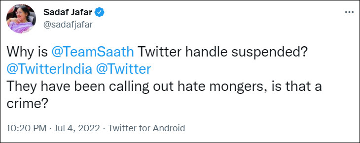 National Coordinator of All India Mahila Congress and riots accused Sadaf Jafar said, “Why is Team Saath handle suspended? They have been calling out hate mongers, is that a crime?”