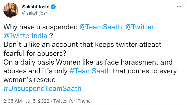 Controversial journalist Sakshi Joshi said, “Why have u suspended Team Saath? Don’t u like an account that keeps Twitter at least fearful for abusers? On a daily basis, Women like us face harassment and abuses, and it’s only #TeamSaath that comes to every woman’s rescue.”