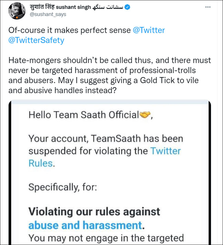 Team Saath’s member, actor Sushant Singh, wrote, “Of course, it makes perfect sense, Twitter. Hate-mongers shouldn’t be called thus, and there must never be targeted harassment of professional trolls and abusers. May I suggest giving a Gold Tick to vile and abusive handles instead?
