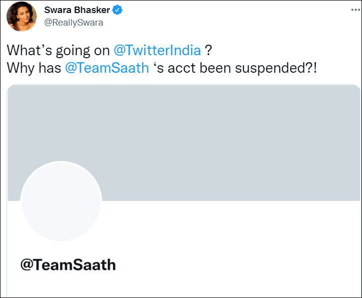Actor and so-called activist Swara Bhaskar questioned why the account was suspended.