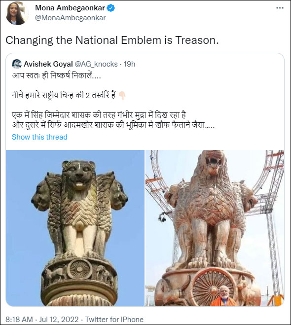 Actor and alleged activist Mona Ambegaonkar declared, “Changing the National Emblem is Treason.”