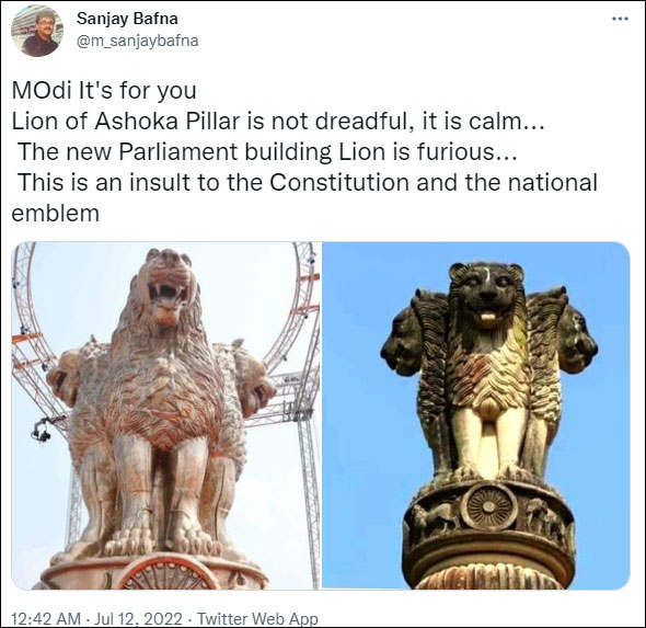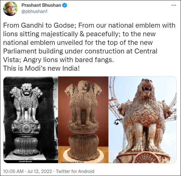 As soon as the reports of the unveiling of the cast were made on social media, the usual suspects saw a great opportunity to criticize the cast for unrealistic reasons. Aandolanjeevi and Advocate Prashant Bhushan said the lion’s faces on the emblem had been changed from peaceful to angry. He said, “From Gandhi to Godse; From our national emblem with lions sitting majestically & peacefully; to the new national emblem unveiled for the top of the new Parliament building under construction at Central Vista; Angry lions with bared fangs. This is Modi’s new India!”