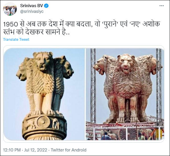 Congress leader Srinivas BV also pointed out the alleged change as if he is not aware that lions possess teeth and they do roar. He published two photographs of National Emblem where the lions were ‘not roarring’ in the first one but roaring in the second. He said, “What has been changed in the country since 1950 is visible in seeing old and new Ashoka Stambha.”