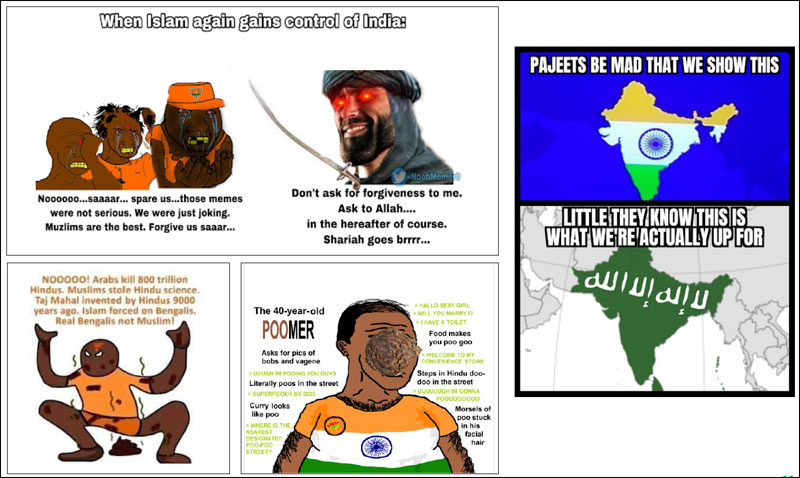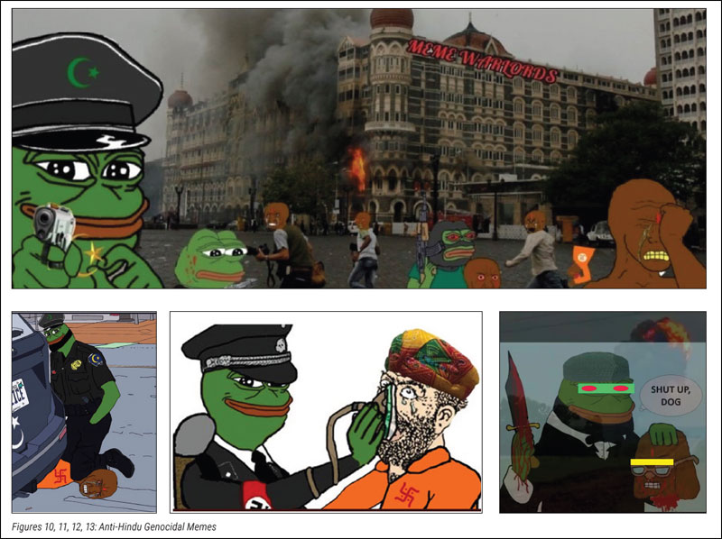 As per the paper titled “Anti-Hindu Disinformation: A Case Study of Hinduphobia on Social Media”, multiple actors, including white supremacists, 4Chan and other extremists, are widely sharing genocidal Pepe memes against Hindus among Islamist web networks through messaging services such as Telegram and other platforms.