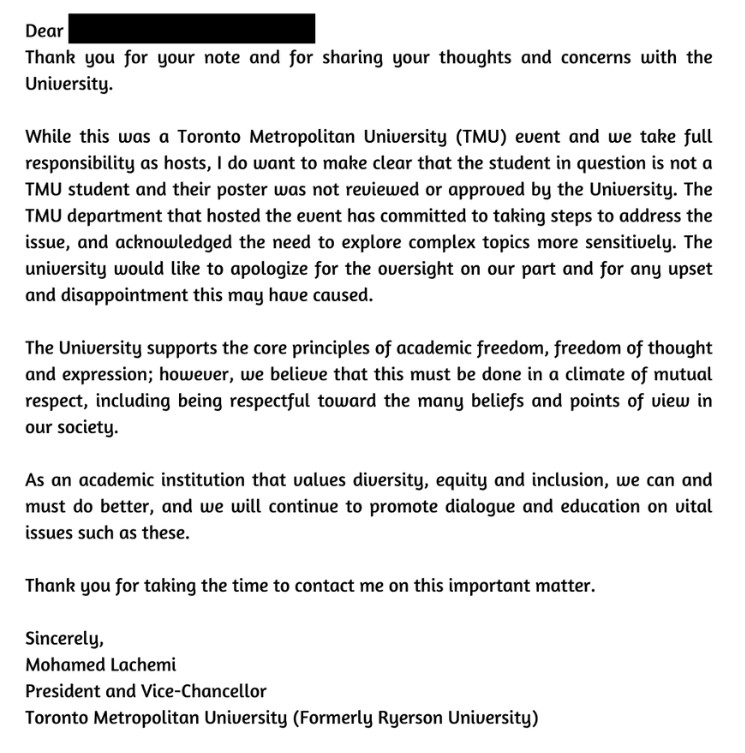 Toronto Metropolitan University had also added a statement on the event’s details page. In the statement, the CERC Migration department of the University said, “We regret that certain content in our Under the Tent presentation on Saturday, July 2 has caused offense and we are taking steps to address this. We are committed to equity, diversity and inclusion while at the same time respecting the diversity of beliefs and points of view in our society. We acknowledge the need to explore and examine complex topics sensitively.”