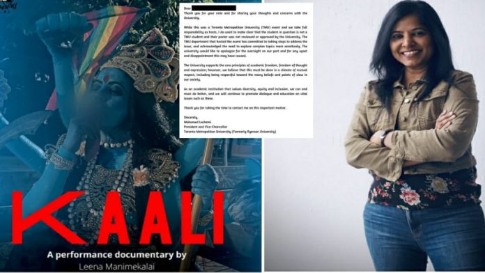 Toronto Metropolitan University, however, disassociated itself from filmmaker Leena Manimekalai. The University said that though it takes full responsibility as the host of the event where the Hinduphobic movie was screened and the ‘Kaali’ poster was displayed, it wanted to “make it clear that the student in question is not a TMU student and their poster was not reviewed or approved by TMU.”