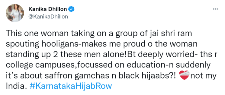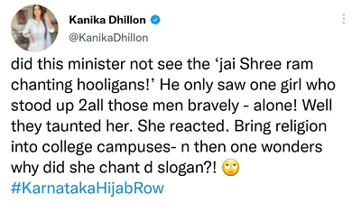 Dhillon had backed Muskan Khan and her ‘right’ to wear Hijab in college campus but later went on to blame the Hindu side for bringing religion into educational institues.