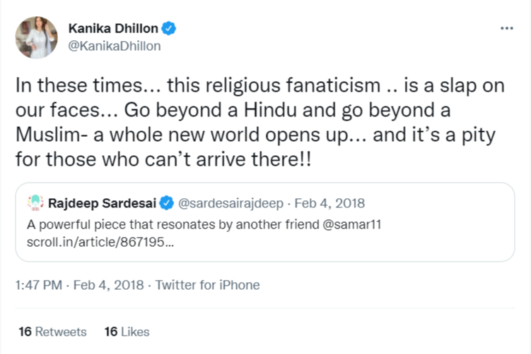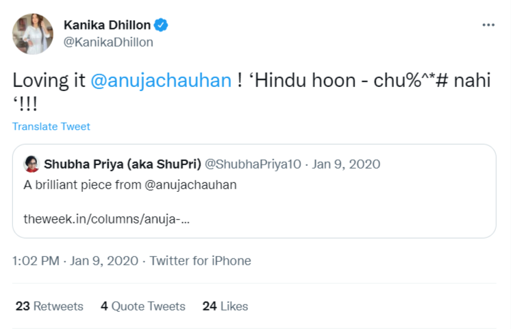 Kanika Dhillon has targeted the Hindu community randomly through her tweets. “Loving it Anuj Chauhan! Hindu hoon chutiya nahin,” she had tweeted in January 2020.