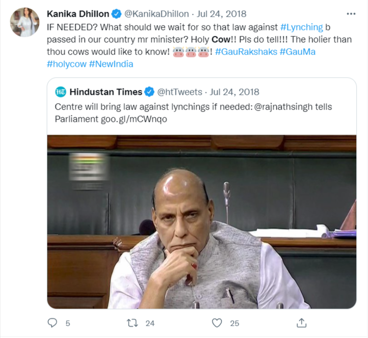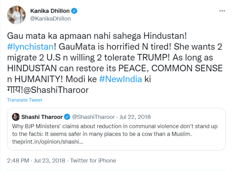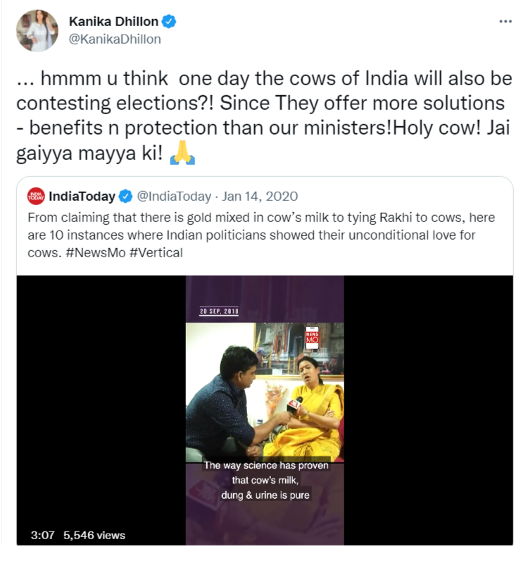 In several of her tweets, Kanika Dhillon was seen invoking ‘Gau mata’ to take potshots at the ruling dispensation at the Centre.