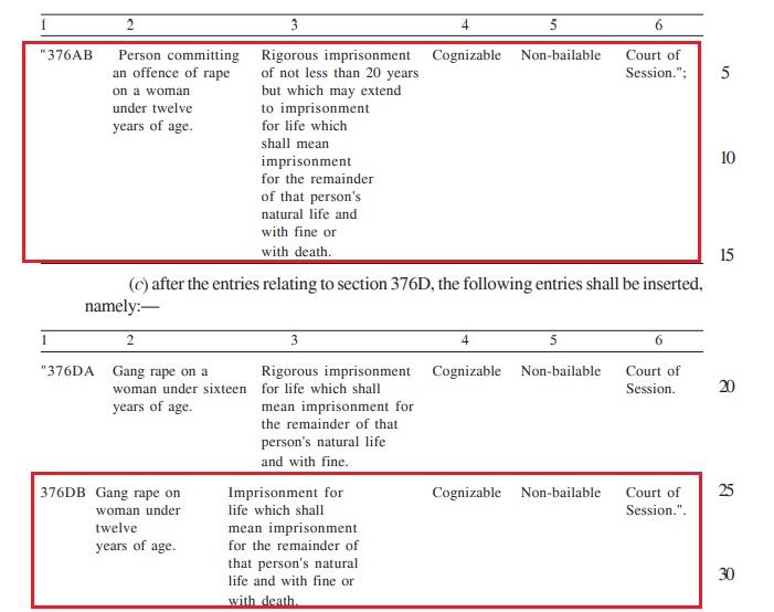 The biggest amendment was perhaps in relation to the rape and gang rape of children below the age of 12 years. For the first time, a provision to award death penalty to the rapist was introduced in the IPC Section 376 (punishment for rape). A new section ‘376AB’ was incorporated into the existing law. It states –