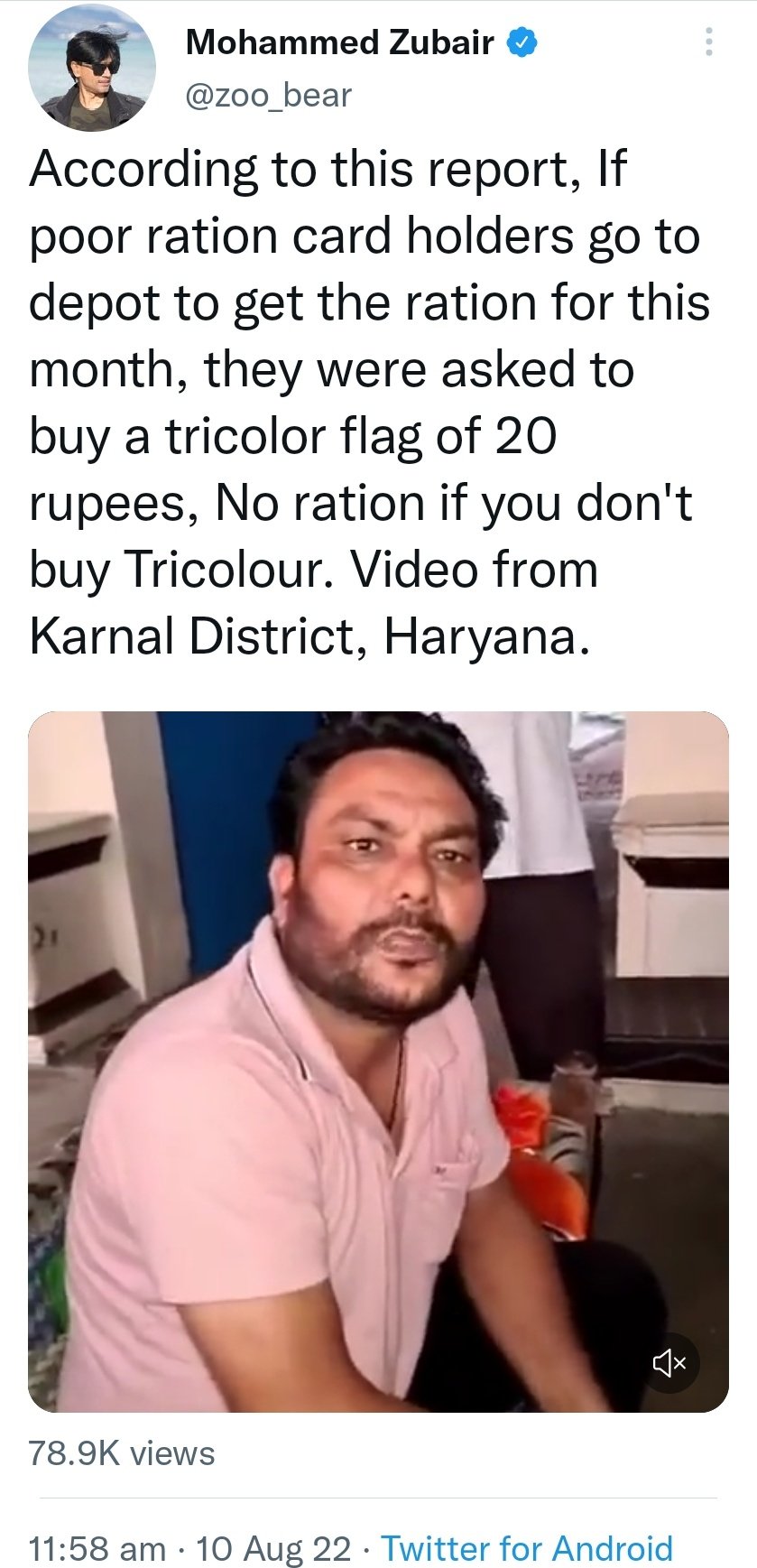 Never one to exercise discretion in sharing news that shows the Centre in a bad light, Mohammed Zubair, who preens on being a ‘fact-checker’, shared the viral video without carrying out a basic fact-check if the government had indeed ordered PDS centres to force consumers to buy Tiranga from them.