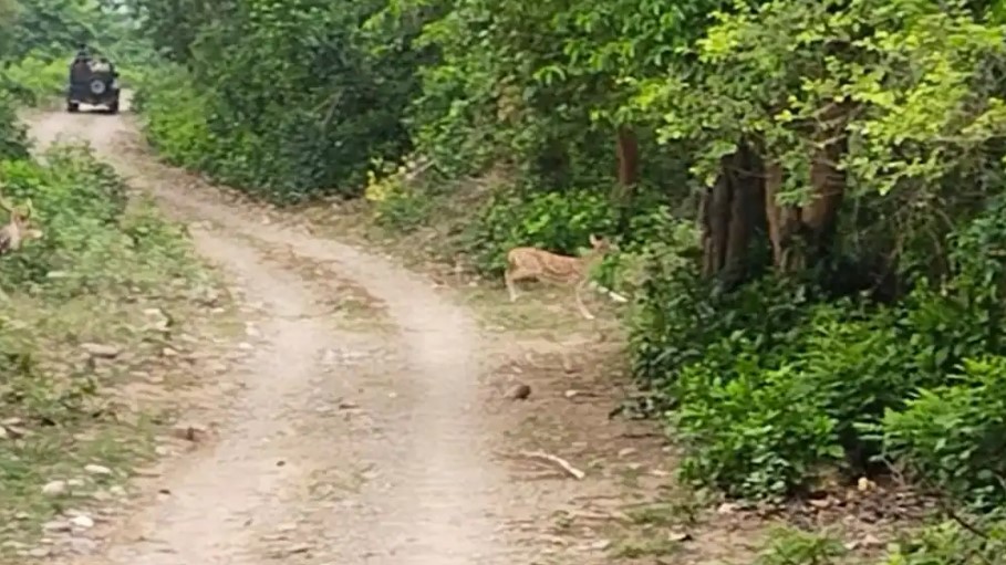 We continued on our trip for about 45 minutes until we reached deep within the forest, where all that was visible were the towers of the Forest Department’s stations and yet another mazar. According to our guide, this location is thought to house the greatest concentration of tigers. At that location, we noticed some deer. A short distance away, a leopard was also spotted crossing the road. The other people who went on safari with us found it weird that there was a tomb there in such a setting.