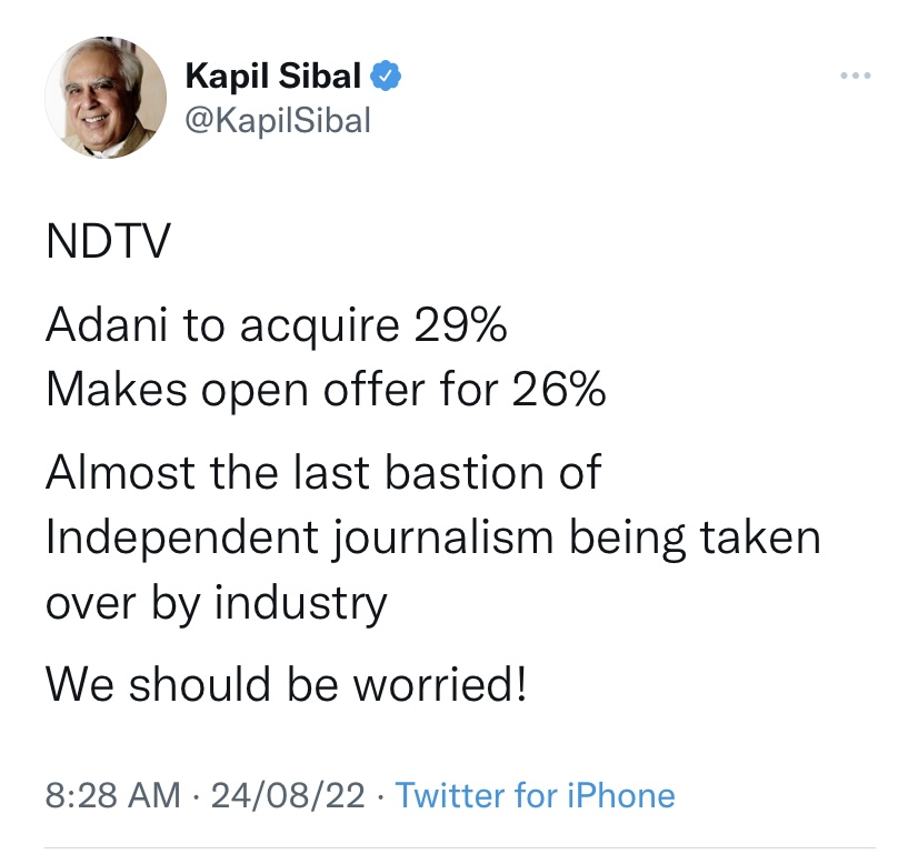 Taking to Twitter, Sibal expressed concern over Adani’s acquisition of NDTV. “Almost the last bastion of Independent journalism being taken over by industry,” said Sibal, who despite being a senior leader of the Congress party, had felt no compunction in backing news channel Tiranga TV, widely believed to have launched as a propaganda arm of the party ahead of the 2019 general elections.