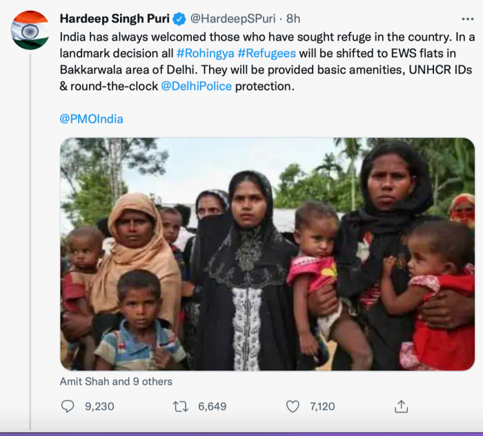 Union Urban Development Minister Hardeep Puri had tweeted that Rohingyas will be given EWS flats and UNHCR IDs