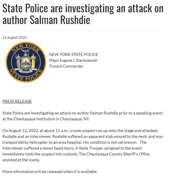 In a press release, the New York State police said they are investigating the attack against Salman Rushdie at the Chautauqua Institution in Chautauqua, NY.