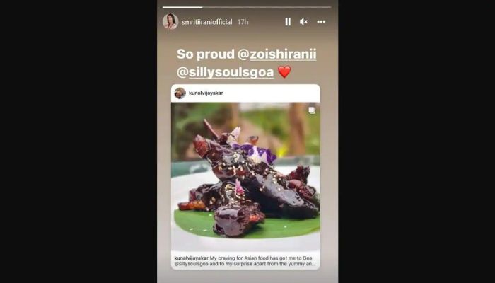 Smriti Irani then posted a screenshot of the post on her Instagram story and wrote, ” So proud Zoish Irani, Silly Souls Goa.” Her story did not corroborate the claim by food writer Kunal Vijaykar that Zoish Irani was the owner of the restaurant.