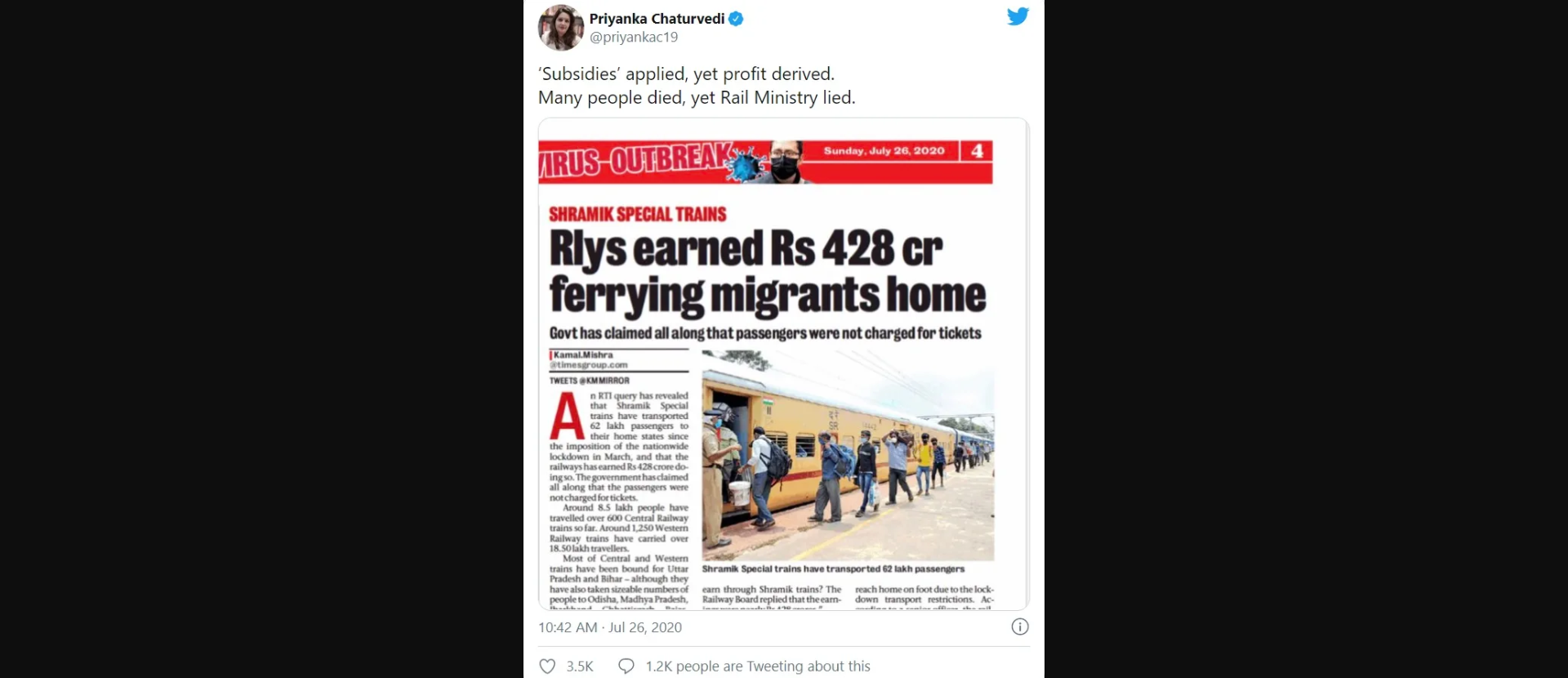 The Sena leader failed to comprehend the difference between the ‘revenue earned’ and ‘profit’. Contrary to the claims of Priyanka Chaturvedi that the Indian Railways earned huge profits, the Railways has spent Rs 2,142 crore on running Shramik Special trains but earned a ‘revenue’ of just Rs 429 crore and did not incur any ‘profit’.