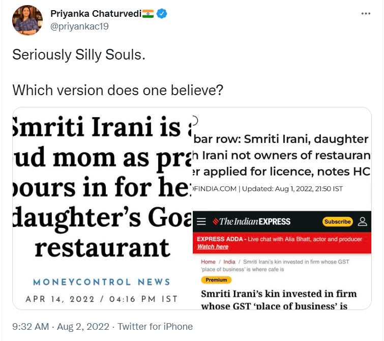 Priyanka Chaturvedi has the right to disbelieve the lawyer of Zoish Irani out of political compulsions. However, the confusion over the ownership, as claimed by the Sena leader, would have still made sense if the matter was raised in April 2022.