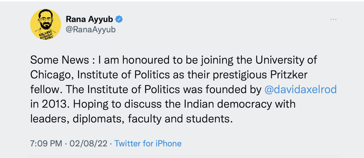 “Some News: I am honoured to be joining the University of Chicago, Institute of Politics as their prestigious Pritzker fellow. The Institute of Politics was founded by @davidaxelrod in 2013. Hoping to discuss the Indian democracy with leaders, diplomats, faculty and students,” Ayyub tweeted on 2 August 2022.