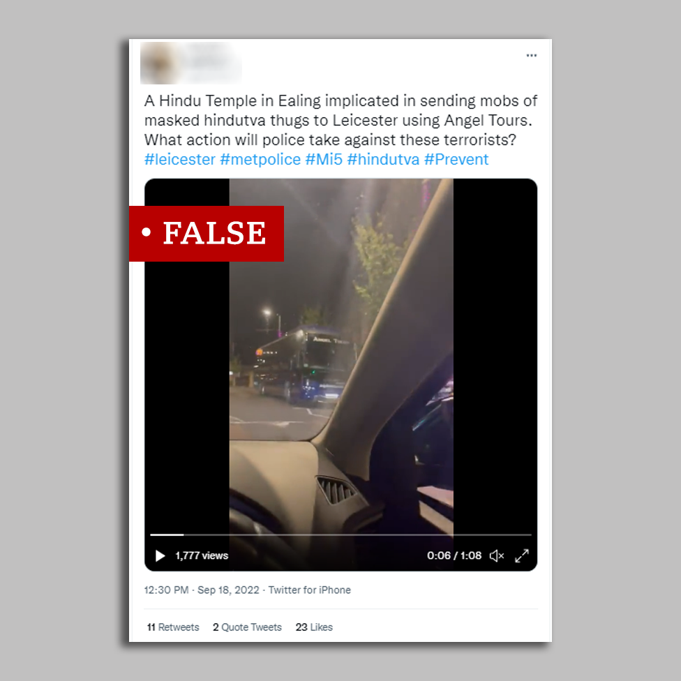 A video that circulated on WhatsApp and Twitter from 18 September showed a coach outside a Hindu temple in London, with a voice claiming the coach had just returned from Leicester. In a video posted the next day on Instagram the owner of the coach company said: “lots of people are calling me, threatening me, abusing me without any reason.” He said that none of his coaches had travelled to Leicester in the past two months and provided evidence from the GPS tracker of the bus in the video showing it had remained in south-east England on the weekend of 17-18 September.