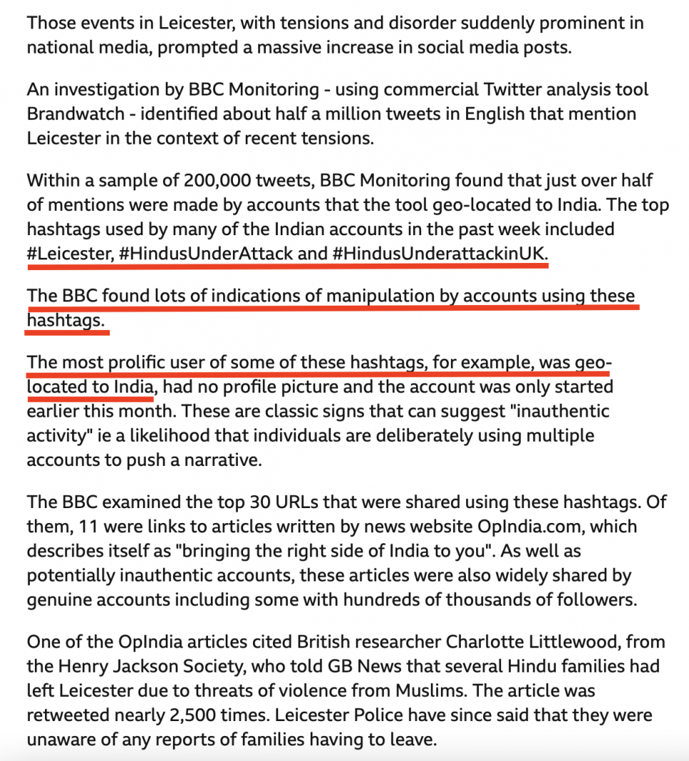 In their report, the BBC basically says that they analysed 200,000 tweets in English that used certain hashtags about Hindus being under attack and that over 50% of these tweets came from India. They then call this “manipulation of the hashtags” insinuating that the Hindu support from India somehow worsened the violence in Leicester.