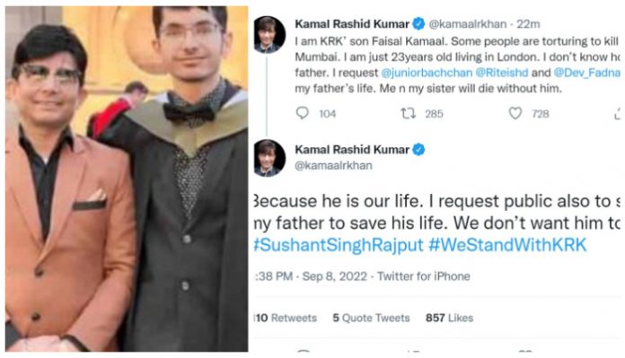 “I am KRK’ son Faisal Kamaal. Some people are torturing to kill my father in Mumbai. I am just 23years old living in London. I don’t know how to help my father. I request @juniorbachchan@Riteishd and @Dev_Fadnavis ji to save my father’s life. Me n my sister will die without him,” Tweeted Faisal Khan.