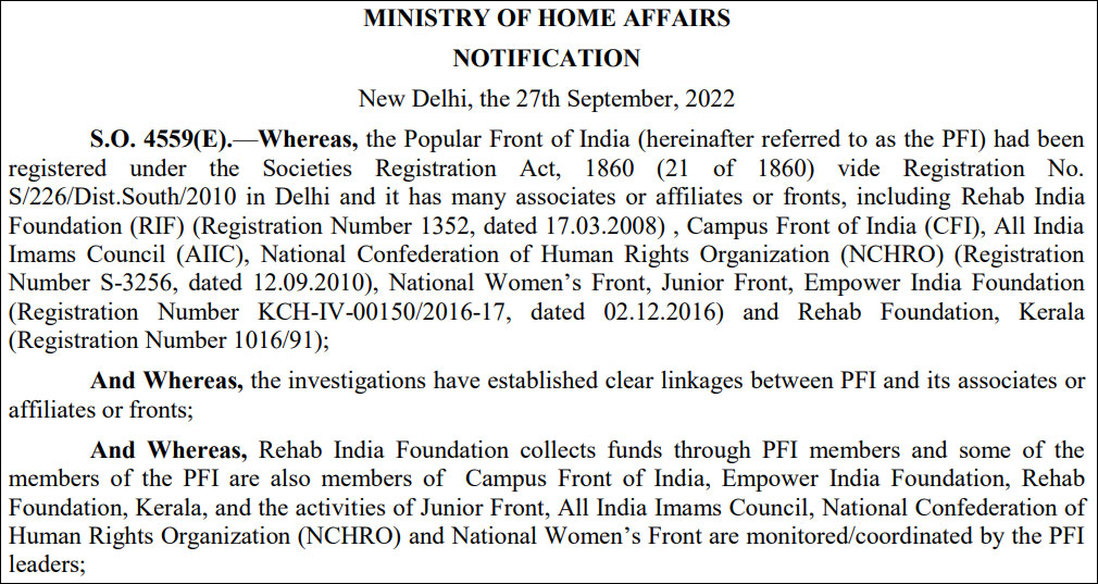 PFI & its associates incl Rehab India Foundation(RIF), Campus Front of India(CFI), All India Imams Council(AIIC), National Confederation of Human Rights Org(NCHRO), National Women’s Front, Jr Front, Empower India Foundation &Rehab Foundation, Kerala declared unlawful associations