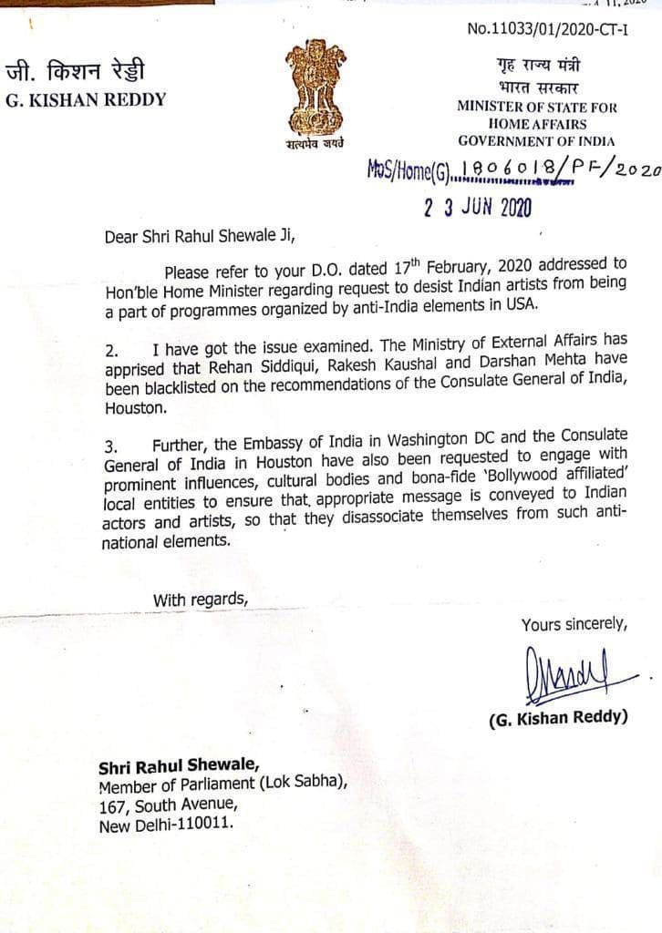Rehan Siddiqui, on the other hand, is a Pakistani ISI agent. In June 2020, Minister of State for Home Affairs, G Kishan Reddy, informed that Union Home Ministry have blacklisted three individuals including Siddiqui on the recommendations of the Consulate General of India in Houston.