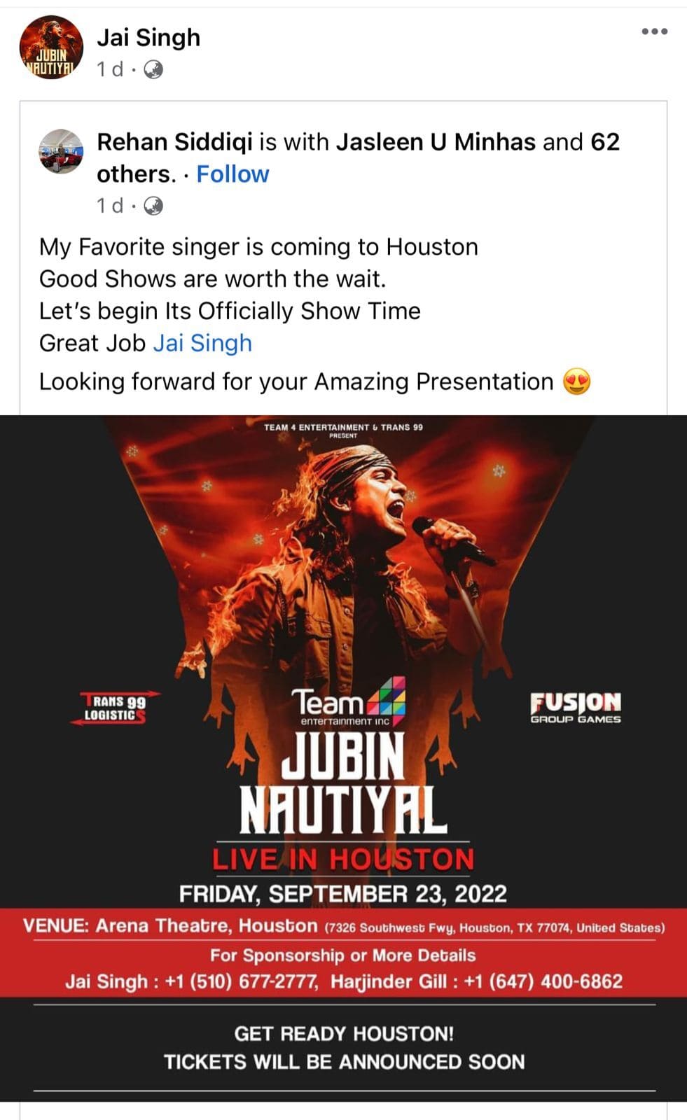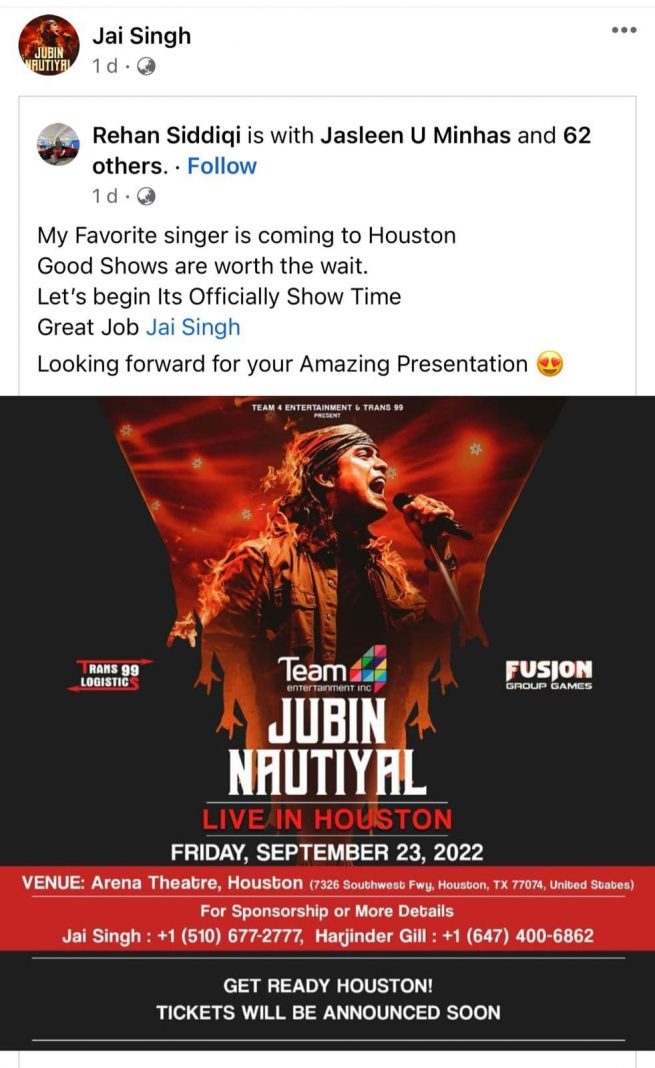 Following outrage on social media, Rehan Siddiqui pulled down his Facebook post. The Houston event, where Jubin Nautiyal was scheduled to perform on September 23 this year, has allegedly been removed for online ticket sales. Amidst the controversy, the hashtag ‘#ArrestJubinNautiyal went viral on social media.