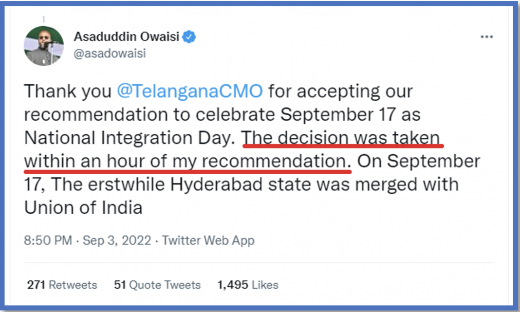 Basically, Owaisi had to give his permission to the Telangana government to commemorate this day. And then he also boasted that it took the government only 1 hour to accept his “recommendation”. This very clearly demonstrates the hold the Owaisi family has on the government. All these years, it looks like KCR only waited for this permission from the MIM to fulfil his own demand! This was the same allegation that the BJP had been making for nearly 25 years – that the previous governments were not commemorating this day out of fear of what the MIM will think. The MIM’s nod is necessary for even any development work to happen in the Old City of Hyderabad. The Owaisi brothers have themselves confirmed on multiple occasions that it doesn’t matter which party the CM belongs to; they all will have to toe the line of MIM only. Sr. Owaisi even claimed the steering of the car (referring to TRS’s symbol) is in MIM’s hand.