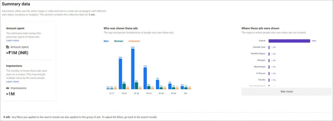 As per the information available, 77.8% of the money was spent on the target audience in Gujarat. Only 19.5% for Punjab, 1.5% for Maharashtra, 1.2% for Rajasthan, Delhi, Haryana, and so on. The page ran 66 ads targeting Gujarat, 41 for Punjab, 9 for Maharashtra, 20 for Rajasthan, 20 for Delhi, and so on.