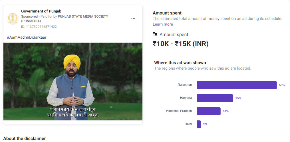 Since October 10, nine ads ran or still running by the page targeting the Punjab region. However, none of these ads had a budget of over Rs 800,000. These ads were made in the Punjabi language. Please note that these are the same ads that ran in Hindi. The statements by the people in the video were dubbed for these ads either in Hindi or Punjabi depending on what language they spoke and the target audience.
