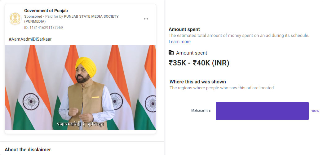 Initially, there were no subtitles on the ads but then subtitles in Marathi started to appear. Even those ads were not in Punjabi but in Hindi. In all the ads, CM Mann talked about Delhi first and then either said similar work is being done in Punjab or would be done in Punjab. He added, “if honest governments are across the country, similar work is possible”. The maximum money spent on these ads was between Rs 35,000 to Rs 40,000. These ads with Marathi subtitles were visible only to the people of Maharashtra.