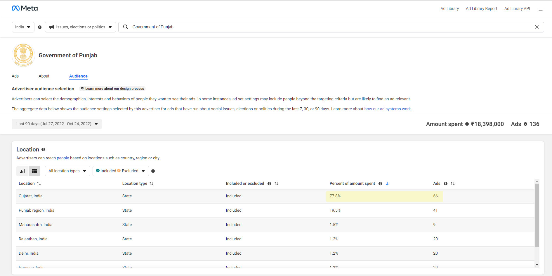 There is a sub-section Ad Library where users can see the details of the ads the page is running. The page started running ads on October 2. First, we checked how much the Government of Punjab has spent and where it was spent. Under the audience section in Ad Library, we changed the timeline to 90 days. By the time this report was published, a total of Rs 1,83,98,000 (One crore Eighty-Three Lakhs Ninty Eight Thousand) was spent by the Punjab Government only on Facebook ads. The page ran a total of 136 ads.