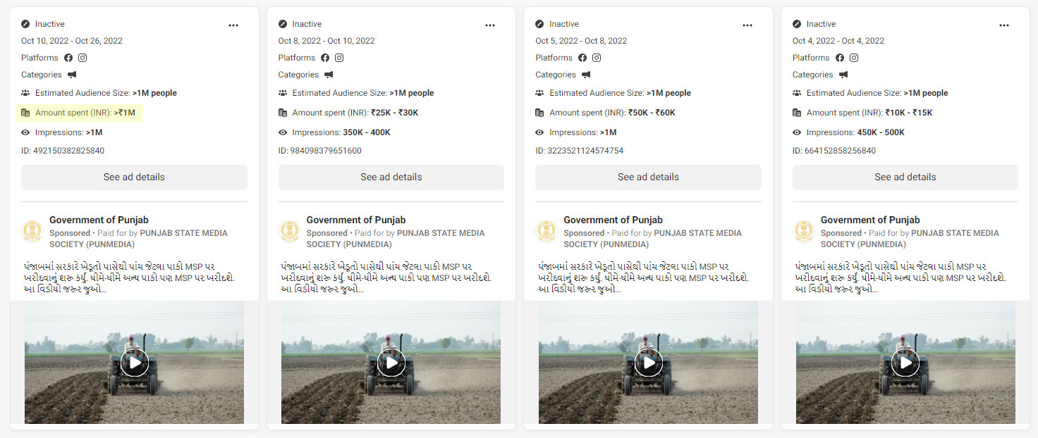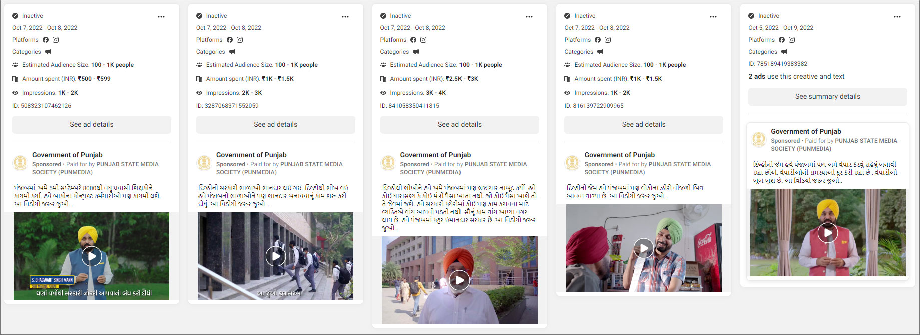 From October 5, the official page of the Punjab Government started running ads with descriptions in Gujarati. Initially, the money spent on these ads varied from Rs 100 to Rs 2,000 with one exception where Rs 90,000 to Rs 100,000 was spent.