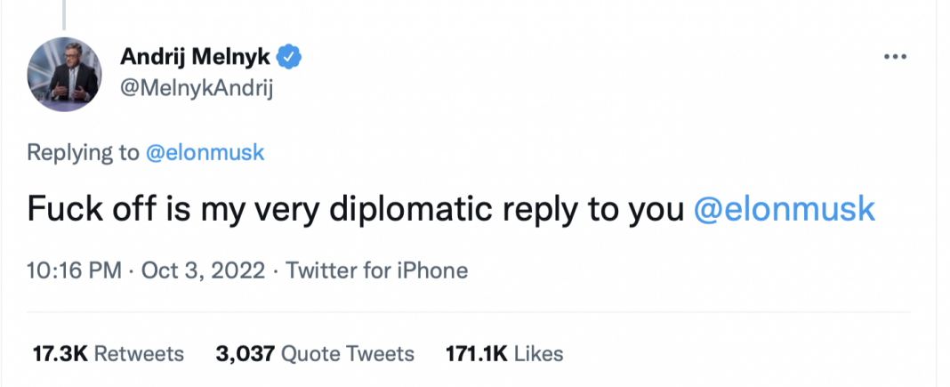 Jason Jay Smart, a journalist working for the Ukrainian media outlet Kyiv Post reminded people that Ukrainian diplomat Andrij Melnyk had recently asked Elon Musk to “f*ck off”.