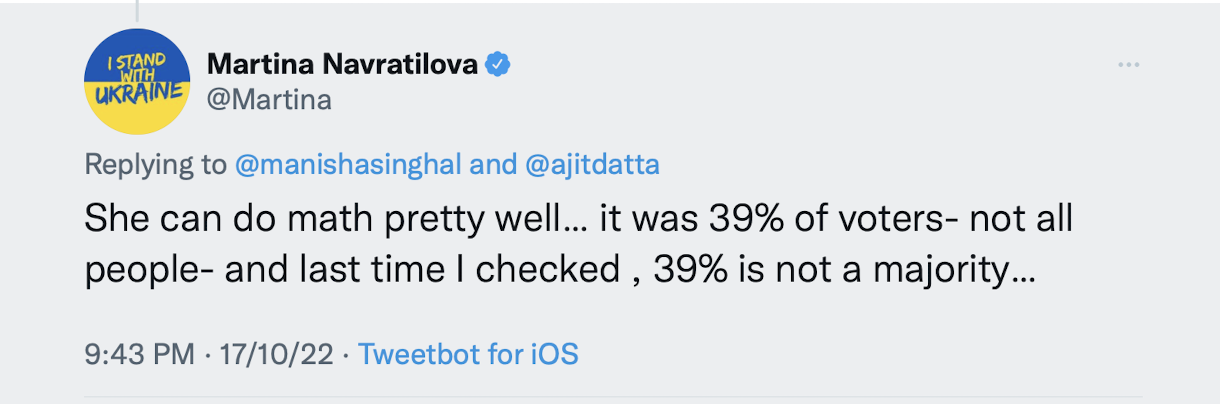 While Martina may not need classes in math, she clearly needs one on how a democracy works and what constitutes a majority in a democratic system. But this is not enough. Martina has a long and storied history of making critical remarks against the Modi government and India, passing off her convictions shaped by her interactions with usual suspects as gospel as she continues the left-liberal propaganda of disparaging India internationally to discredit the BJP regime.