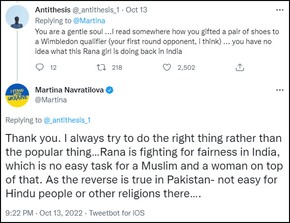 In all the comments that Martina received over meeting Ayyub, one reply caught our eyes. A Twitter user named Antithesis commented, “You are a gentle soul …I read somewhere how you gifted a pair of shoes to a Wimbledon qualifier (your first-round opponent, I think) … you have no idea what this Rana girl is doing back in India.”